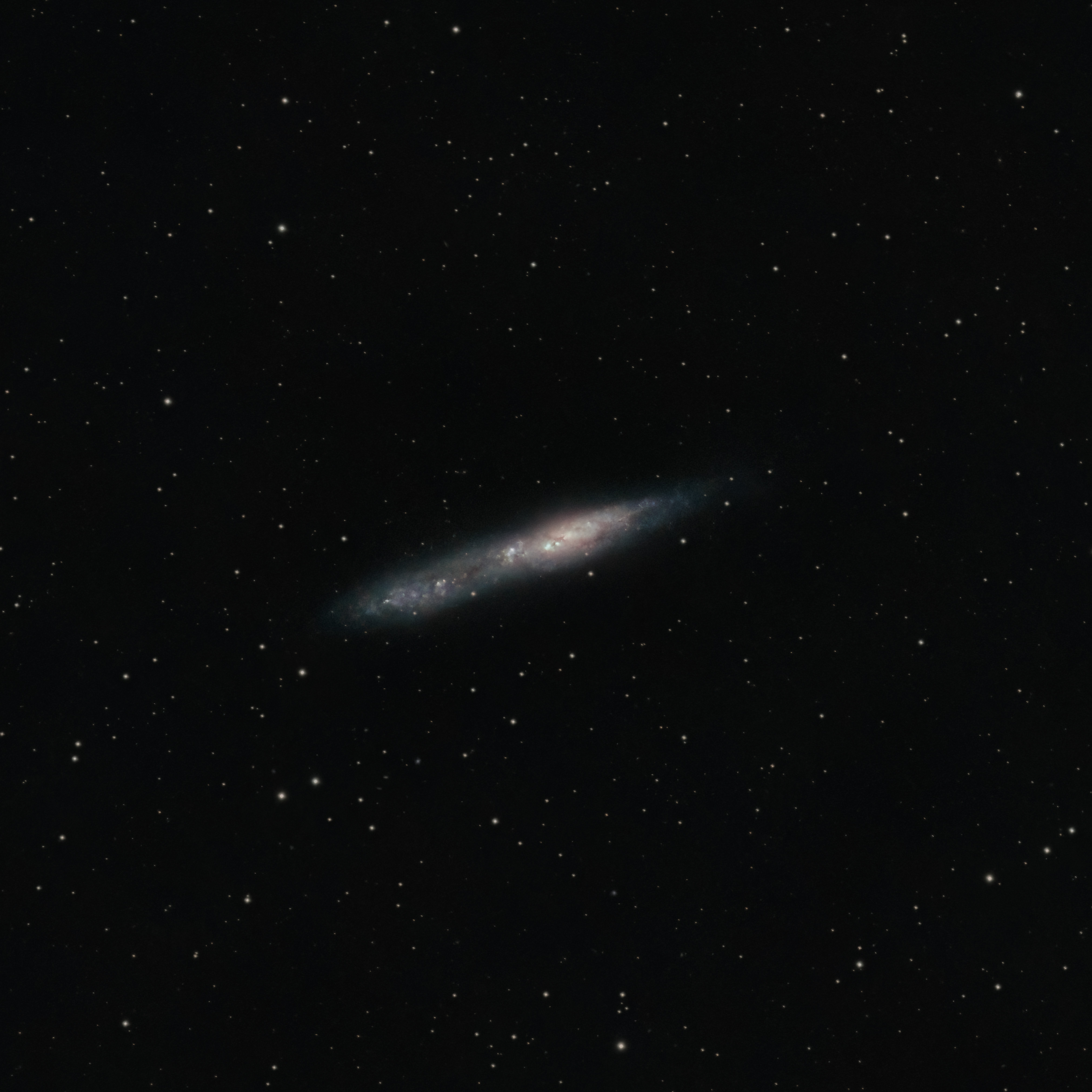 NGC55: Astrographe TS76EDPH à 340mm de focale F/D:4,5 et camera ASI533MC. Gain 105, T°:-10°C, offset: 30. Filtre Ir-Cut sur EQM35Pro. 35 poses de 240″ + 25 Darks. Guidage: lunette TS50 F/D: 4 + ASI224MC. Pointage, guidage et capture sur Kstars/Ekos. Prétraitement et drizzle, séparation des couches, starless et étirement de l’histogramme sur Siril. Retrait de gradient et denoise: GraXpert. Montage des couches: Photoshop, Topaz DenoiseAI, HCActions. Combinaison HO-RVB avec les sessions précédentes.