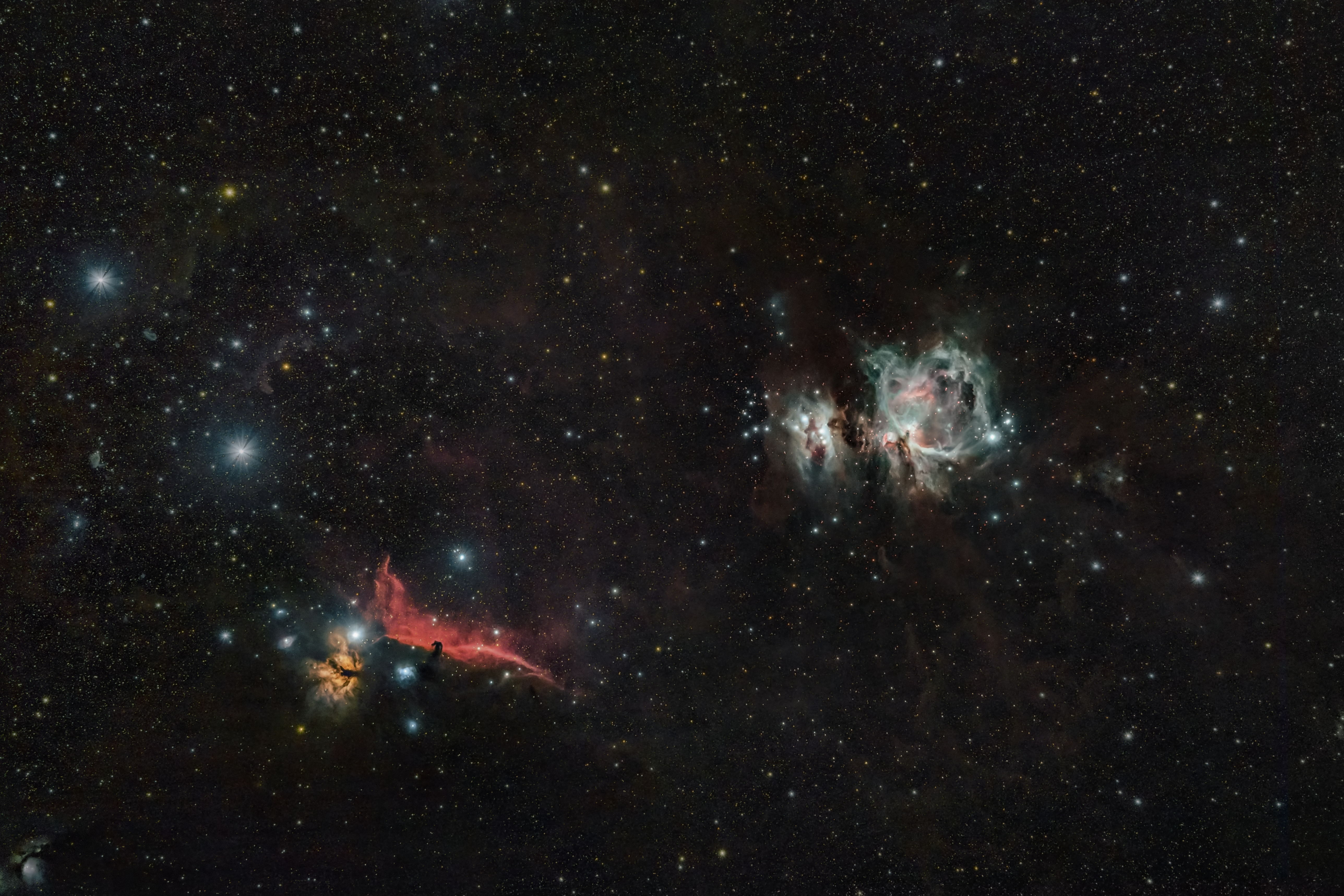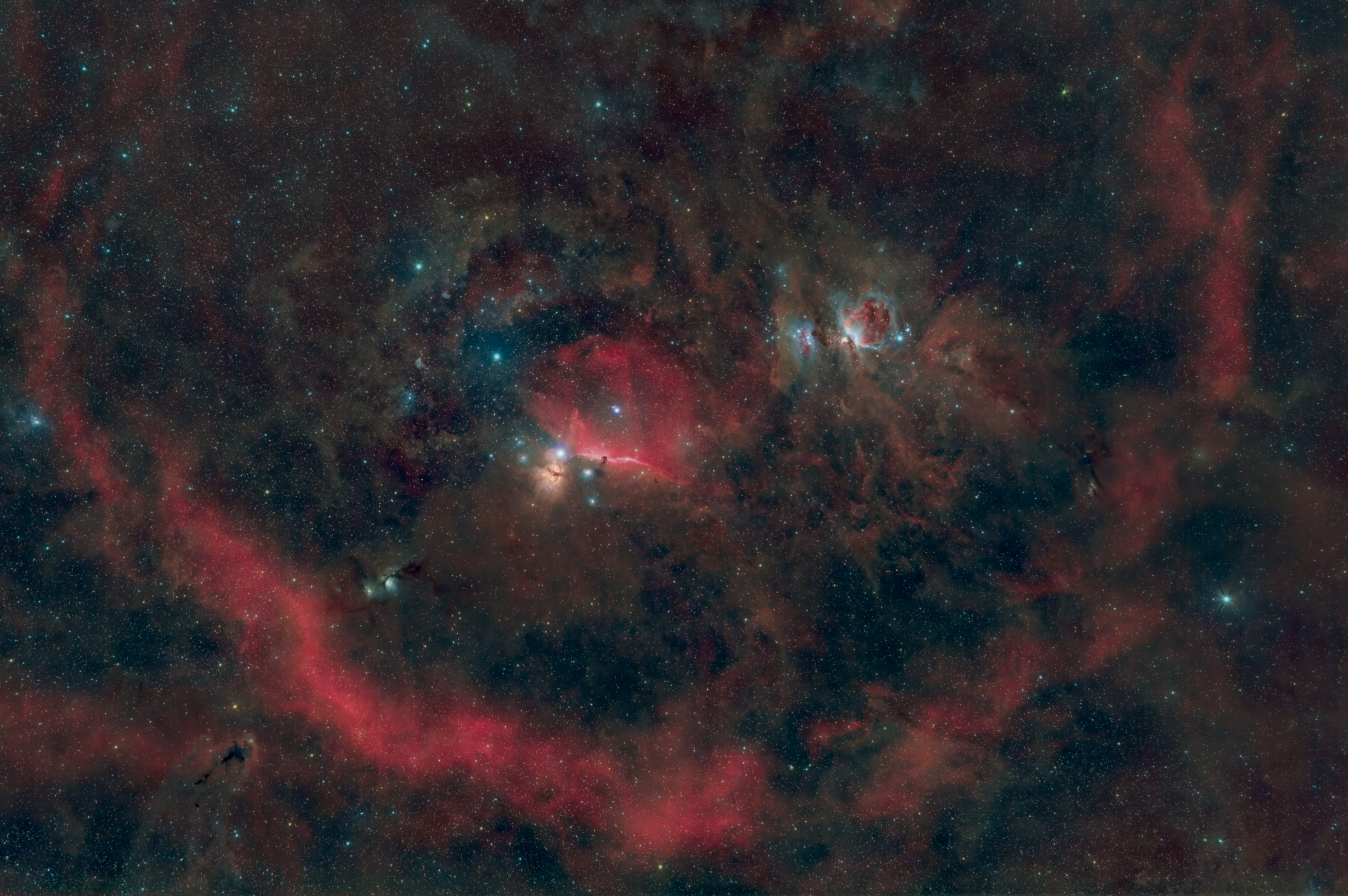 La partie centrale de la constellation d’Orion est une zone très riche en nébuleuses et gaz interstellaire. La grande boucle rouge, la ceinture de Barnard, entoure les trois étoiles du baudrier d’Orion: Mintaka en haut, Alnilam au centre et Alnitak en bas, bordée par les nébuleuse de la Flamme (NGC2024). Juste à côté la célèbre Tête de Cheval (IC434) se détache sur un fond rouge écarlate. L’épée d’Orion est matérialisée par la grande nébuleuse M 42.