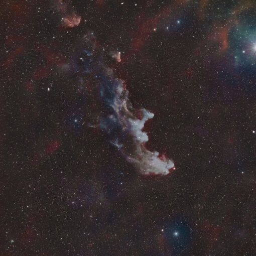 Astrographe TS76EDPH F:4.5, Caméra ASI 533MC Pro, gain:200, T°:-10, filtre Antlia Tri-Bandes. 43 poses de 60″ + 25 Darks. Guidage: Tamron 70-300@300mm + ASI224MC. Pointage, acquisition et guidage sous Kstars/Ekos – MacBookPro 16″ M2. Prétraitement: Siril, Etalonnage: Photoshop, Topaz DeNoise AI.