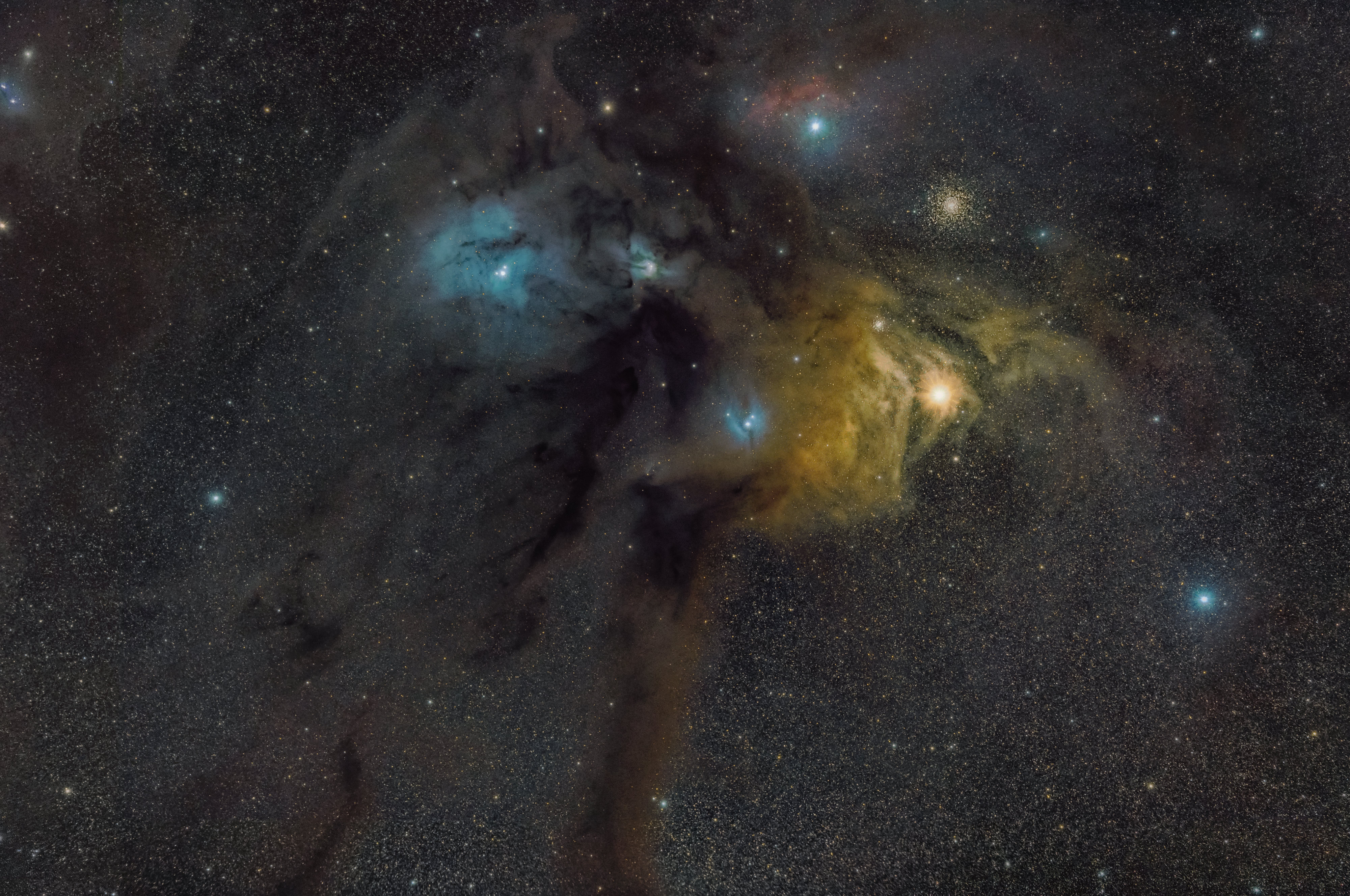 Entre Rho Ophiuchi qui apparait dans une nuée bleue comme une étoile multiple à gauche et la jaune Antares (alpha Scorpi) se développe une combinaison de nuages de gaz et de poussière interstellaires, illuminés par les jeunes étoiles bleues ou la géante Antares et en avant plan des nuages obscurs masquent plus ou moins ces nébuleuses brillante. Ces nuages sont à une distance de 420 années lumière. Par un jeu de perspective le gros amas globulaire M4 (7195 AL) en haut à droite et le petit NGC 6144 (29000 AL) sont donc situés à des distances beaucoup plus grande en arrière plan.