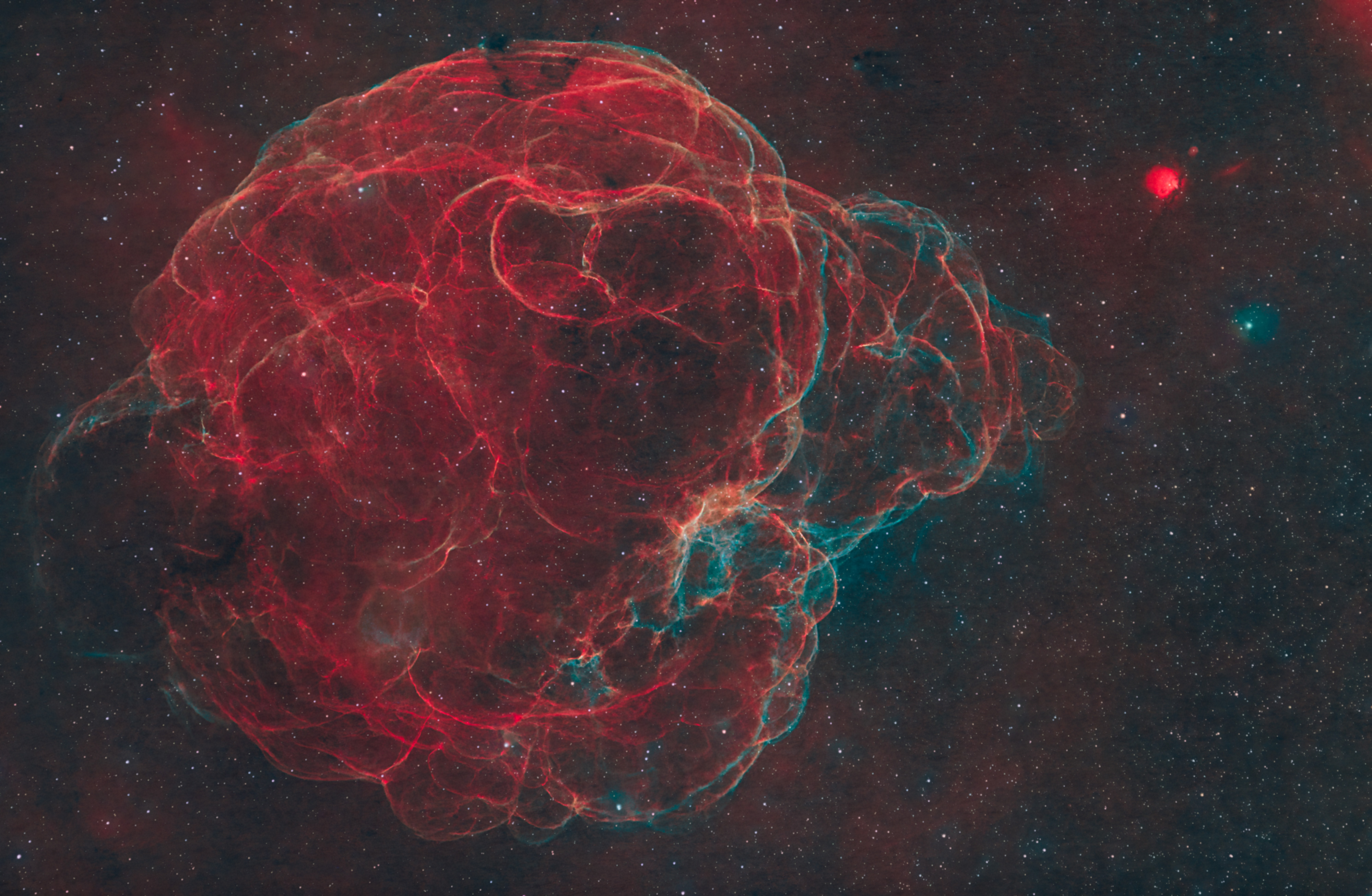 -4 Composition RVB avec pour le canal rouge le fichier Ha résultant de la soustraction du continuum et pour les autres canaux le fichier OIII précédemment calculé.