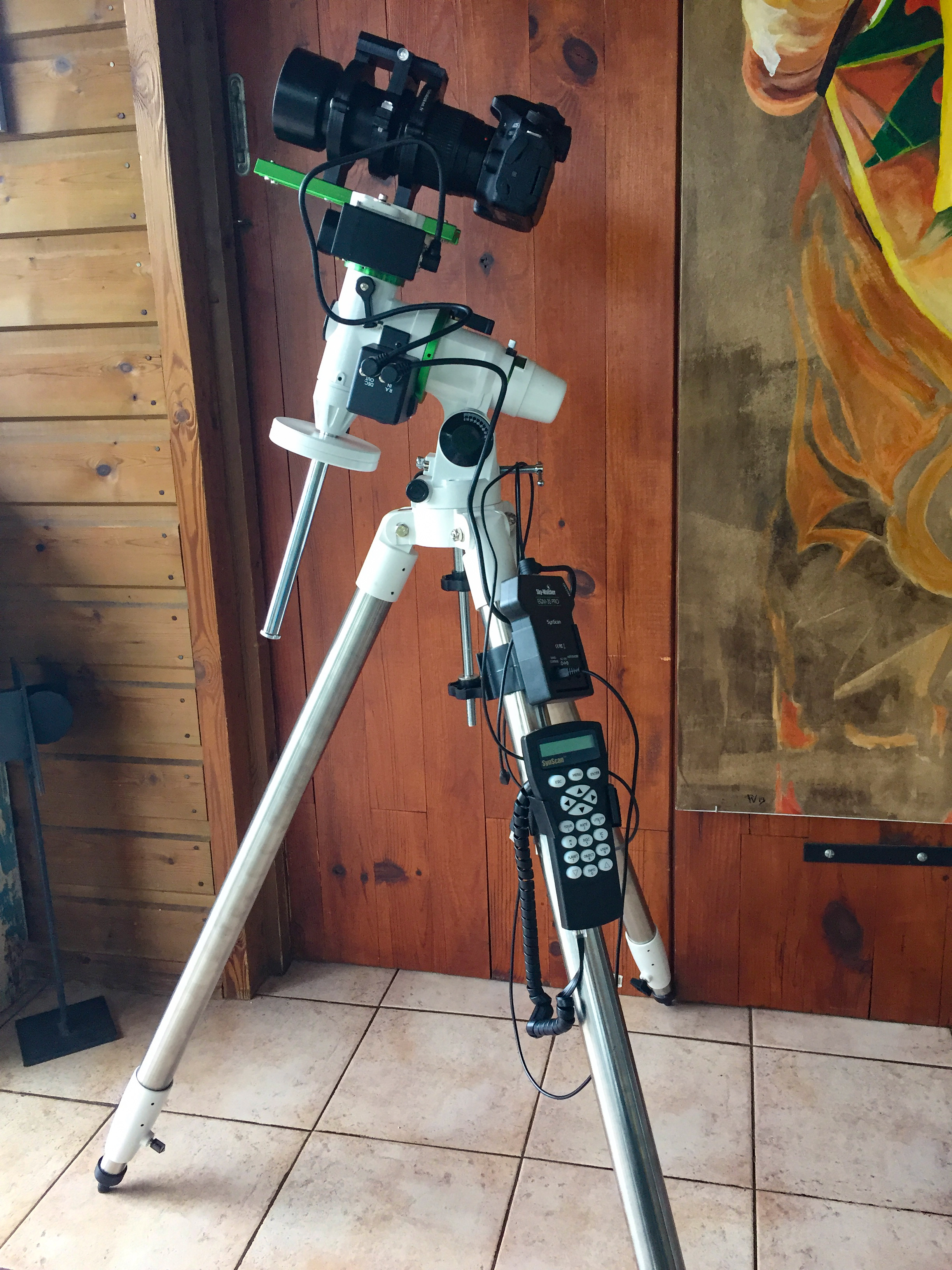 Ici montée avec le Samyang 135 F:2 avec une bande chauffante contre l’humidité et montée sur la petite Star Adventurer Mini. C’est mon setup de voyage !