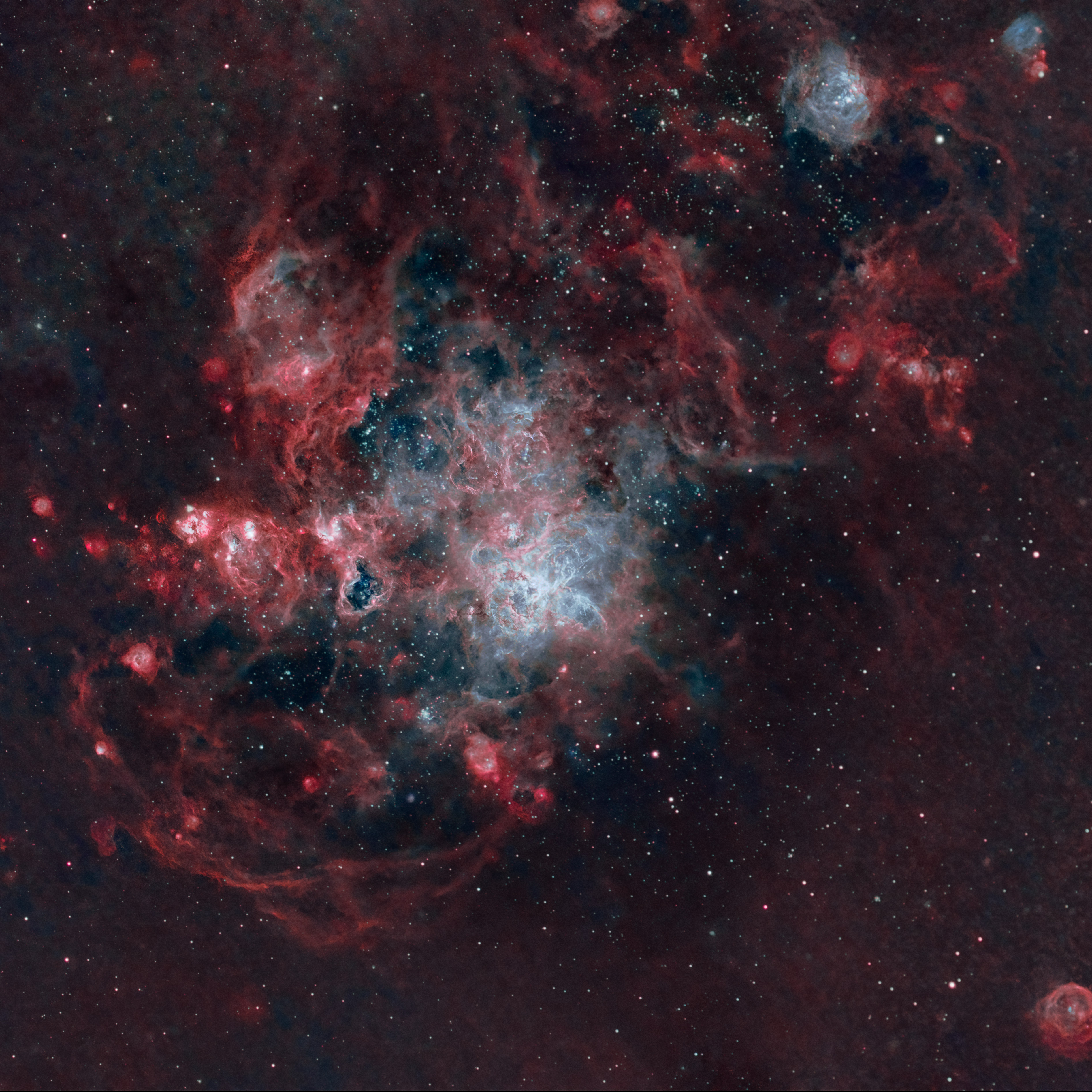 À seulement 160 000 années-lumière de la Terre, le Grand Nuage de Magellan (LMC) est l’une des galaxies les plus proches de la Voie Lactée et un véritable laboratoire d’astrophysique. En son cœur se trouve 30 Doradus, plus connue sous le nom de nébuleuse de la Tarentule, la région de formation d’étoiles la plus active du Groupe Local.